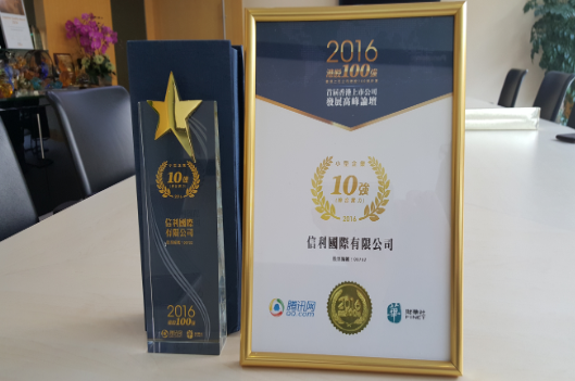 今天(2017年4月18日) 由騰訊網及財華社聯合主辦的“香港上市公司港股100強評選典禮” 於香港JW萬豪酒店舉行,信利國際有限公司獲得2016年度香港上市公司港股100強評選之 小型企業“綜合實力10強”之一, 排名第四。